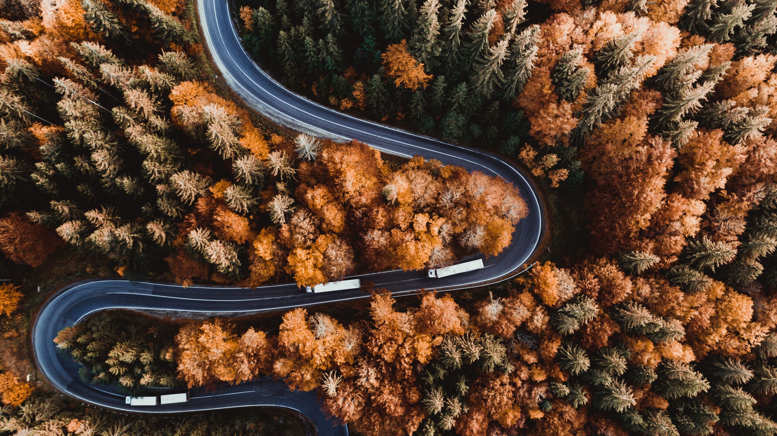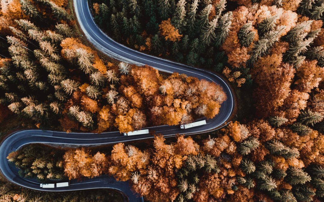 Aerial view of mountain road with truck heavy traffic